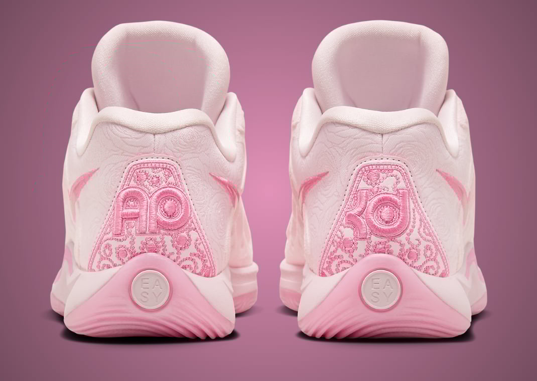 A bright pink Swoosh adorns the midfoot, perfectly matching the intricate embroidery on the heel, where AP for Aunt Pearl is embroidered on the left shoe and KD for Kevin Durant on the right. Inside, the sneaker features Aunt Pearl and Kay Yow branding, continuing the collaboration with the Kay Yow Cancer Fund, which has been a part of the Aunt Pearl series since its inception. The tonal pink theme extends underfoot with a pink foam midsole paired with a pink rubber outsole, ensuring the shoe is as functional on the court as it is meaningful off it.
