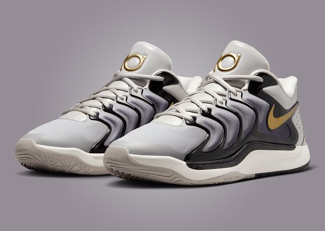 The Nike KD 17 NYE takes on tonal grey, black, and sail hues, and these neutral shades are accented by metallic gold on select portions. These golden pops are found along the KD logos on the tongue and the Swoosh logo on the midfoot. For its base, we see an engineered mesh in a light sail hue that transitions into deeper grey hues as you work back from the toe to the heel. Air Max Plus-inspired TPU overlays reinforce the upper and come dressed in black. Light iron ore is present along the tongue leather tongue, matching the hue of the laces above and the heel overlay. Below sits a Zoom Air-cushioned foam midsole in sail and black paired with a two-tone grey and black rubber outsole.