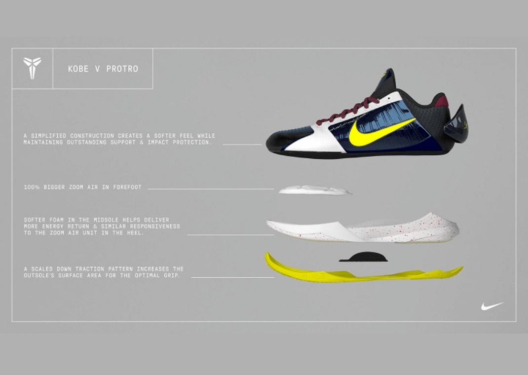 "Protro," coined by Kobe Bryant, stands for "Performance Retro.” This concept is about retaining the classic design that fans have grown to love but updating the internals with the latest tech to cater to the modern athlete's demands. The Protro allows sneakerheads and basketball players to experience the best of both epochs: iconic design and unparalleled performance. For example, the Nike Kobe 5 Protro tweaked cushioning to include Zoom Turbo and reworked the outsole to have a tighter traction pattern.