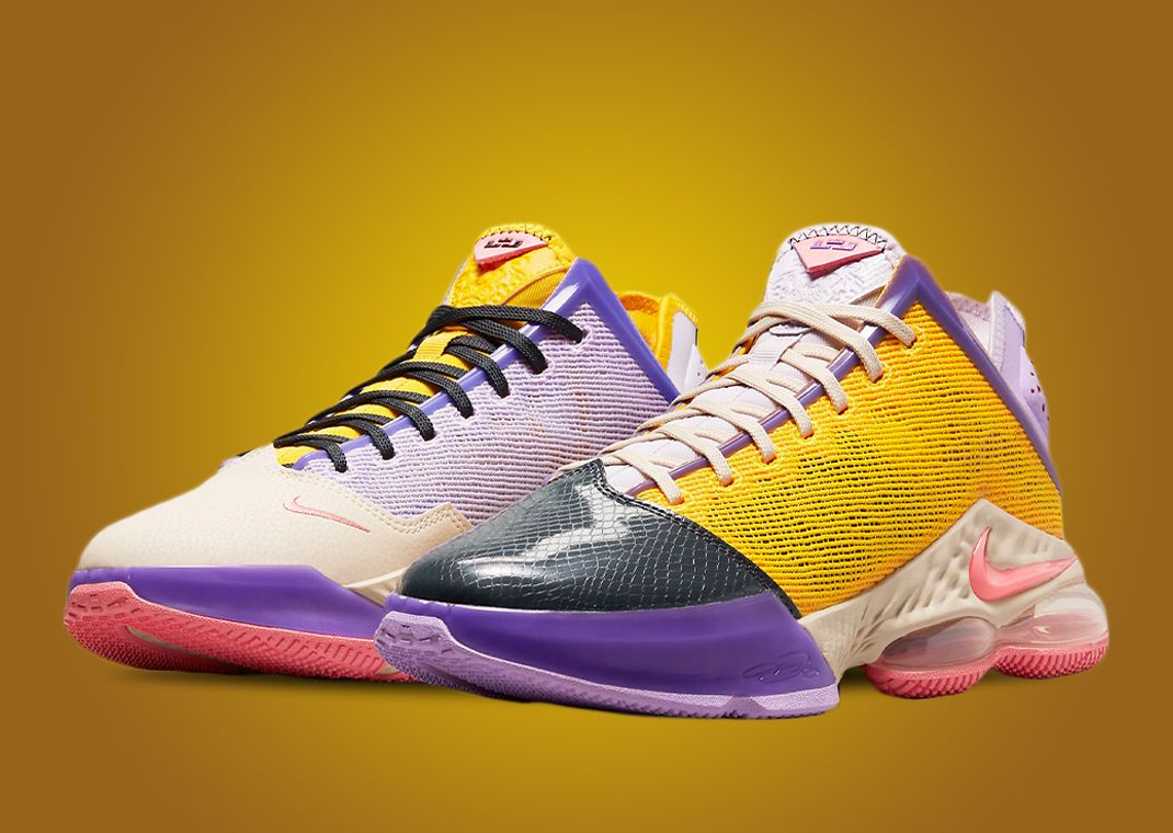 Coming mismatched in both colors and materials across the left and right pair, Lakers shades of gold and purple as well as pink, black, and lilac appear throughout. Tan smooth leather and black faux-snakeskin come split between the right and left pair’s toebox respectively, while the mesh netting of purple and gold get split in the same manner. More gold hits appear on the right pairs tongue and sockliner with purple appearing on the internal padding, while the left sneaker uses cream shades and yellow in these spots. Black and white laces take over the right and left pairs with the LeBron crown logo atop the tongue sitting on a pink leather tab. Back on the heel, both pairs feature a lilac-colored overlay with leather on the left and canvas on the right. Underfoot, the LeBron 19 midsole with an exposed Air unit on the heel paired with a mismatched rubber outsole, pink on the left and gold on the right.