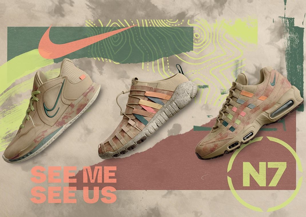 N7 is Nike’s call out to the Seventh Generation Principle. Philosophy of the Haudenosaunee (Iroquois), the Seventh Generation Principle states that the decisions we make today should result in a sustainable world seven generations into the future. So, it should come as no surprise that the footwear features the Moc silhouette, Kyrie Low 5, and an Air Max 95. The Moc this time around features Free Crater Trail tooling, a fusion of sustainable foam technology, the comfort of the Free midsole/outsole, and the rugged durability of the Trail outsole. The tan upper is splattered with brown detailing throughout, a coloring and pattern that is also seen on the upper of the Air Max 95 and the midsole of the Kyrie Low 5. The ribbons that make up the lacing structure of the Moc follow the same color motif as the apparel, using ribbons of different green shades, peach, orange, and yellow to accent the earth-toned upper. Similar ribbon detailing can be seen on the Air Max 95, while the Kyrie Low 5 features accents of those colors throughout the shoe via the branding accents and laces.