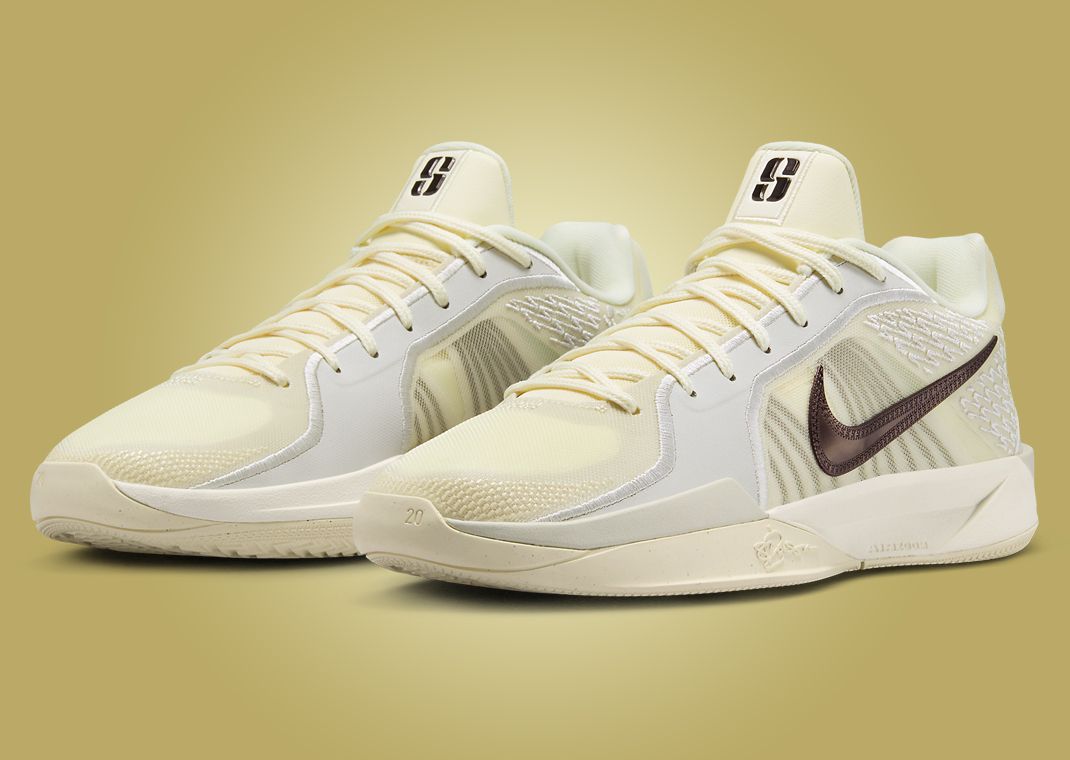 Tonal hues of coconut milk cover most of the sneaker, including the engineered mesh base, semi-transparent mesh on the midfoot, the tongue, and the lace set. Contrasting these creamy hues are the S panels along the eyestays, coming in light bone and lined in a light bone textile. Branding for Sabrina atop the tongue and the Nike Swoosh on the midfoot are coated in a metallic bronze finish. More details nodding to Sabrina include: