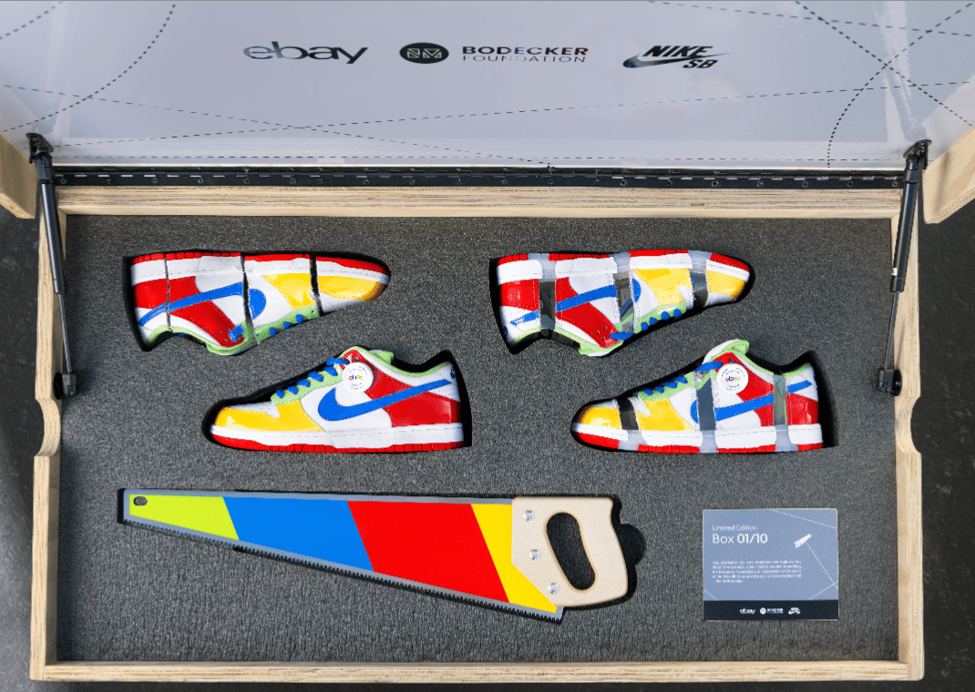 Ten special box pairs will be auctioned off on eBay beginning December 7th, 2022 and will include a tribute pair of the eBay x Nike SB Dunk Low - featuring one intact pair and one that is cut into four pieces. Also included in the box are a pair of the new eBay x Nike SB Dunk Low "Sandy Bodecker" that comes with transparent windows mimcking the cut-up sneaker as well as a commemorative saw and a skateable shoe box. All net proceeds will go to the Bodecker Creative Foundation, helping support young people with educational and professional development opportunities through hands on creative programs in the areas of art, design, music, and other disciplines.