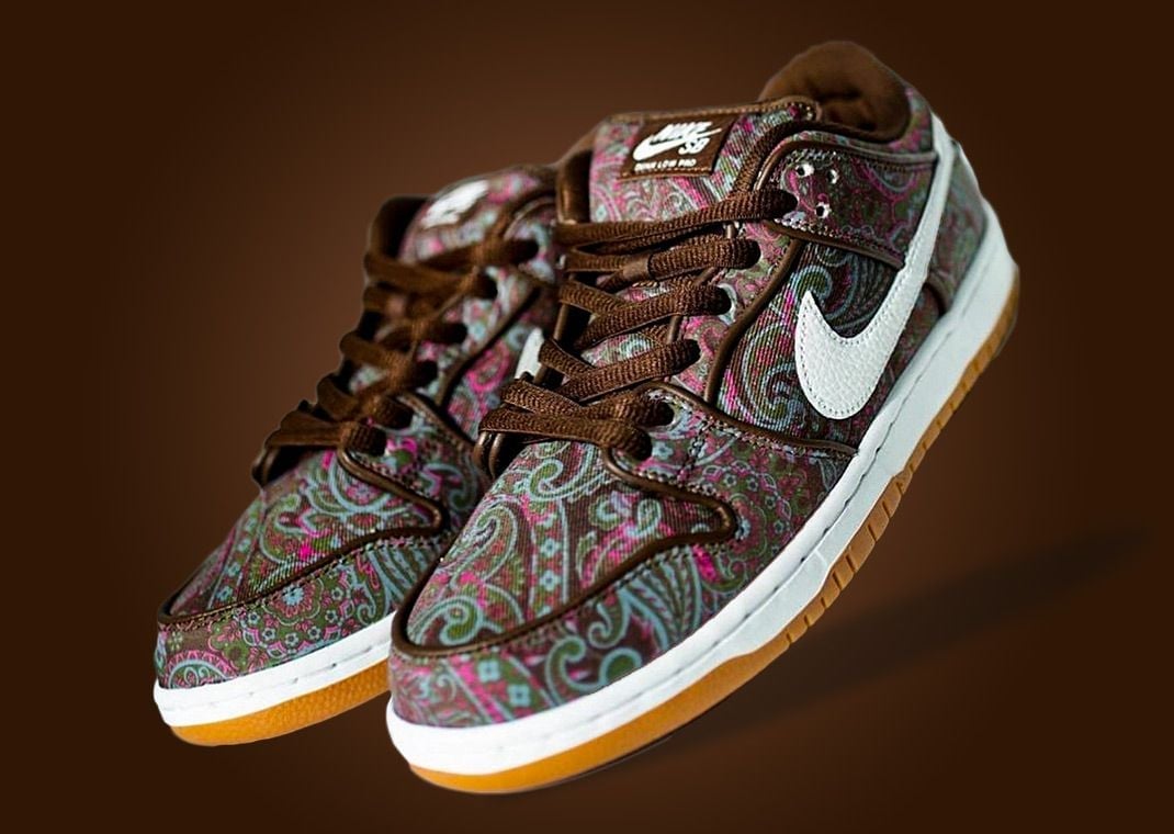This SB stands alone, featuring a chocolate brown base that is accented by paisley print throughout the canvas upper. Hits of purple, blue and green are used on the print to make things pop. A familiar white midsole matched to a gum outsole is also featured on this colorway. Many will make comparisons to the Travis Scott Nike SB Dunk Low as that shoe also featured paisley print on the canvas portions of the sneaker. However, this is not a Cactus Jack collab.