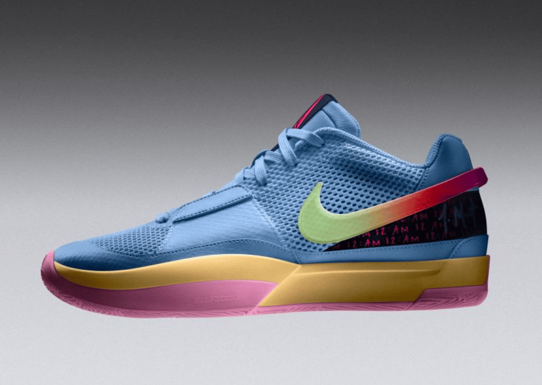 As for the sneaker itself, tech specs haven't been spelled out though we can determine a few things based on logos and other new Nike basketball models. Across most of the upper sits a breathable mesh while leather overlays wrap around the toe all the way back to the heel and connect along the medial side. Near the eyestays you’ll find another patch of leather to help reinforce the upper and a set of flat laces that work up toward the Nike Ja logo, designed to represent “the verticality, speed and sharpness of Morant’s game, and his ability to rise above all obstacles.” For its Nike branding, a large Swoosh logo wraps around the heel and connects to the medial side with this pictured colorway receiving a gradient pattern that transitions from green to purple. Just below this on the heel counter is a black leather overlay with “12 AM” text in an iridescent finish, nodding to the moments in his childhood when he would stay up late training to achieve his goals. Underfoot sits a two-tone muslin and pink Zoom Air cushioned midsole paired with a pink grippy rubber outsole.