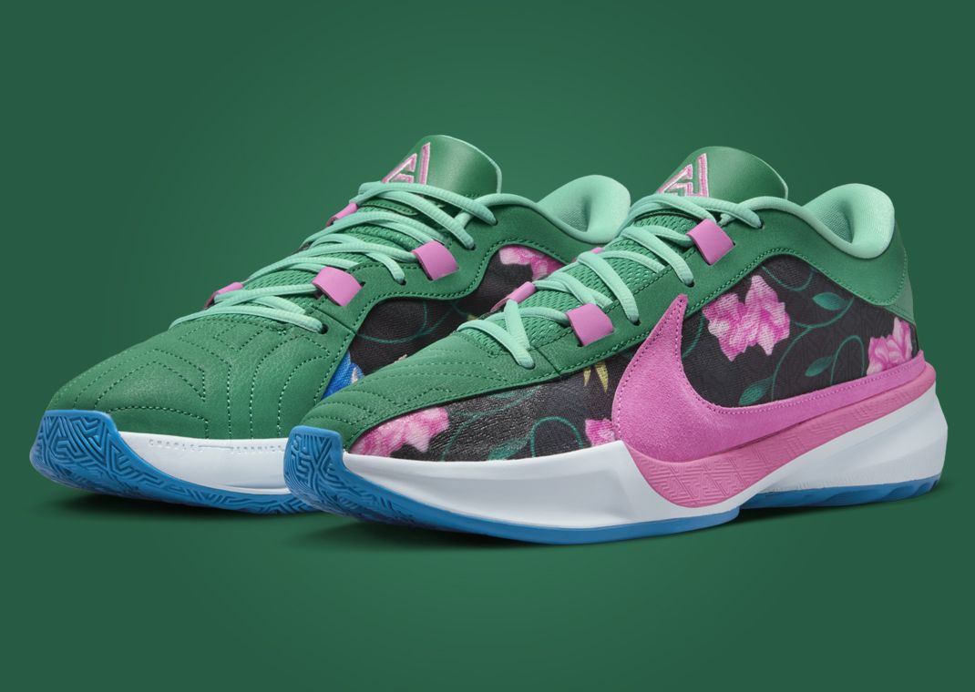 As the NBA season nears its climax, the Milwaukee Bucks, led by Giannis Antetokounmpo, are looking to hold onto the second spot in the Eastern Conference. Amidst the intense competition, Giannis has showcased his unparalleled skills on the court and his unique sense of style through various iterations of his fifth signature sneaker with Nike, the Zoom Freak 5. Following looks at the heartfelt Ode To Your First Love colorway, the Nike Zoom Freak 5 introduces a new theme, "Floral Love," drawing inspiration from the rich floral heritage of Giannis' Nigerian and Greek roots.