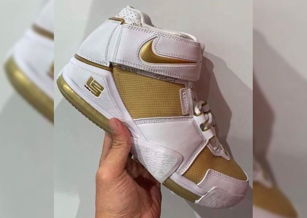 While the original black, white and varsity crimson, as well as the white and midnight navy pair are confirmed to drop, an all-new colorway will be released alongside them. Nicknamed the “White Metallic Gold” edition, they come in a clean white, varsity crimson, and metallic gold color scheme. Similar in design and looks to the Nike Zoom LeBron 2 “Maccabi” player exclusive originally worn by James during the 2004-05 NBA season, this pair sports a white-based upper with metallic gold accents. The only hit of varsity crimson that we can see so far is via the crown on the classic LeBron logo on the heel.