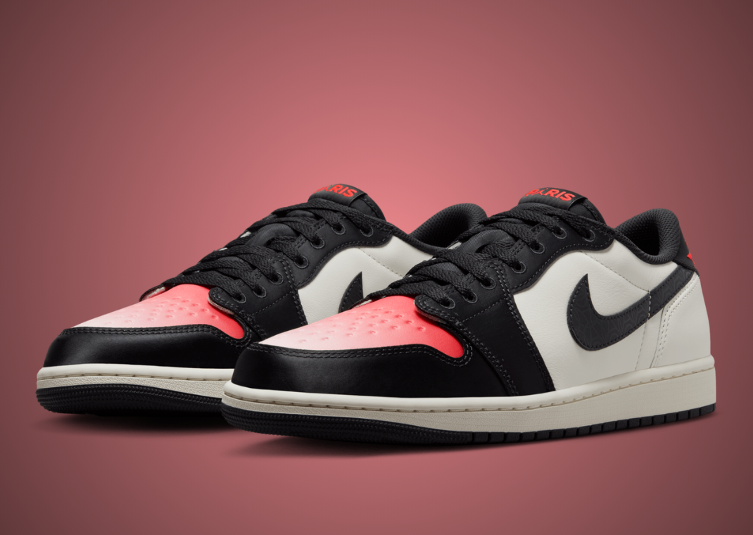 PSG’s Air Jordan 1 Retro Low OG features a sophisticated blend of sail and black hues contrasted with vibrant infrared 23 accents. The sneaker’s upper combines sail leather on the midfoot and heel overlay, while the toebox is crafted from a neoprene-like material typically seen on the Jordan 1 Low EX variant. This toebox boasts a gradient pattern that transitions from sail to a soft pink/infrared 23 shade, adding a dynamic touch to the classic silhouette.