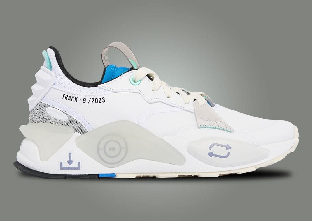 The Puma RS-X takes on a much cleaner color palette. All white mesh and leather layer the upper with small detail hits of teal and royal blue found on the tongue, eyelet, pull tab, and toe stitching. Grey mesh on the back heel matches with translucent hits on the heel and mid foot, which feature an MP3 player navigation and repeat song button. White continues on the midsole with the only interruption being a blue download symbol. Sail and black split the outsole with a small hint of royal blue.