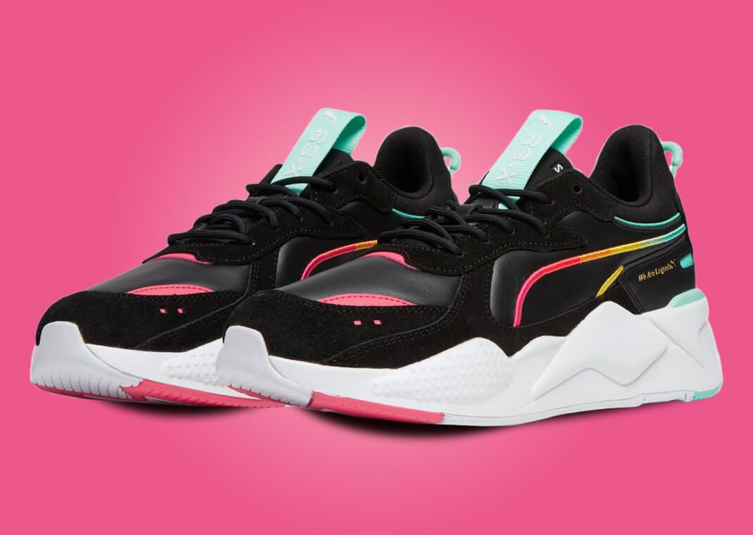 The Puma RS-X WAL "Carnival" is a masterclass in storytelling through footwear. Embodying the spirit and joy of Carnival, the sneaker boasts a mixture of smooth leather and high-quality suede, primarily seen in a black hue. The utilization of multi-color hits on the embroidered Formstrip and portions of the toe, tongue, and heel exudes the jubilance of Carnival. Nodding to the collective that helped design the sneaker, “We Are Legends” in metallic gold is debossed near the lateral heel and placed on the insole. Rounding out the look is the white foam midsole paired with a white, pink, and blue rubber outsole.