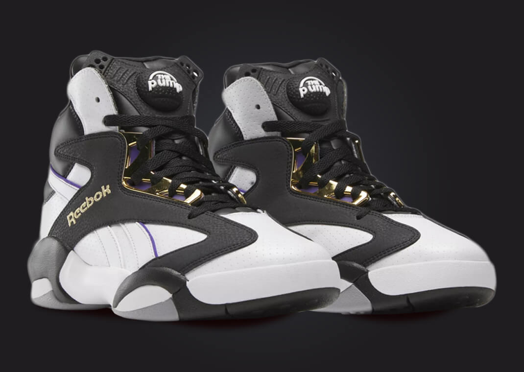 The Reebok Shaq Attack MVP comes in a clean white, core black, and gold metallic colorway. The upper is white and black, made of various materials such as nubuck and leather. Gold Metallic accents add a touch of elegance to this pair, while subtle hits of regal purple tie back to the Lakers theme. Reebok Pump technology and Shaq branding on the back heel complete the look for this classic pair of kicks.
