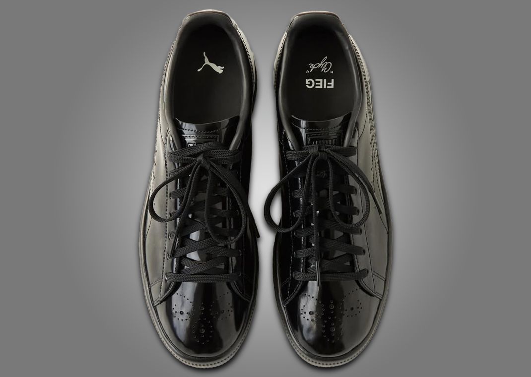 The tongue tag features co-branded logos for Puma, Walt “Clyde” Frazier, and Ronnie Fieg. Inside, the insole splits Puma branding and logos for Fieg and Clyde on the right and left shoes, respectively. Underfoot, a tonal black midsole and outsole sit.