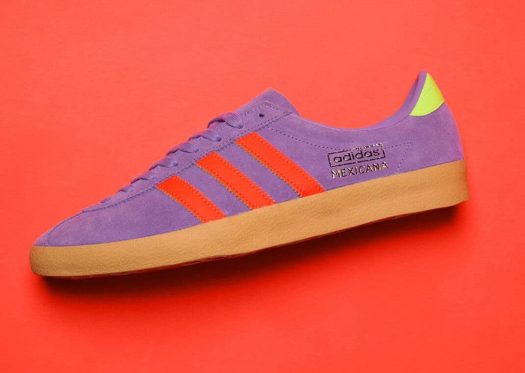 The Mexicana first appeared at the 1968 Mexico Olympic Games and has been in the vault for quite some time. Now, size? is offering two colorways of the model. Both pairs boast bold red, purple, green, and yellow hues on suede-wrapped uppers with premium leather accents. Golden foil Mexicana branding gets placed on the lateral collar, while Three Stripe branding comes in purple on the “Red” pair and red on the “Purple” colorway. This bright color palette is an homage to colors seen on the street of Mexico during the yearly Cinco De Mayo celebration. Underfoot sits a gum rubber sole unit, completing the design.