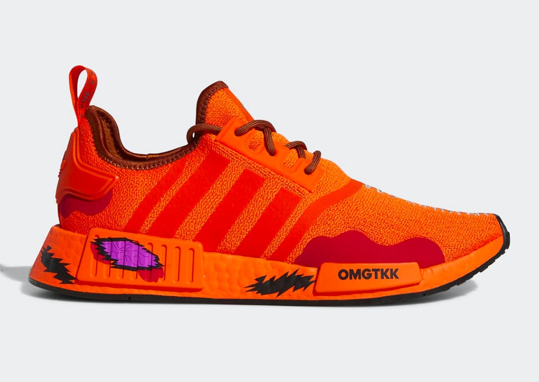 Cartman is the only one of the four that gets two sneakers, both Forum Lows. His signature pair features a puffy red upper with black Three Stripes branding on the sides, finished off by yellow and teal accents. His superhero disguise, A.W.E.S.O.M.-O 4000 edition sports a light brown upper with hits of purple, yellow, and red above the toebox, finished off by black and metallic silver accents. Rounding out the footwear collection is an appearance from supervillain Professor Chaos, aka Butter’s in disguise. His adidas NMD R1 V2 has a teal-based upper with neon green laces, and silver accents.