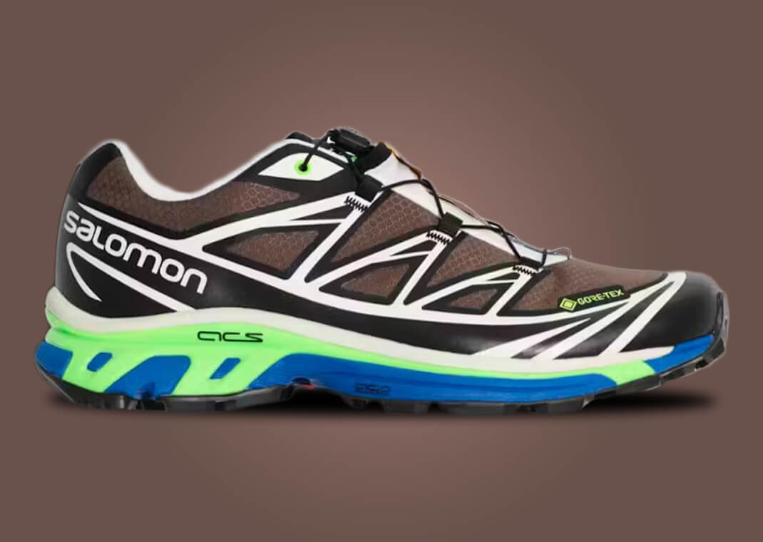 SSENSE’s Salomon XT-6 Gore-Tex is poised to be a hit among trail runners and streetwear fans. Retaining all the technical prowess, Salomon is renowned for, the shoe has been amplified with a Gore-Tex layer, promising superior waterproof protection. Aesthetically, the design showcases a harmonious blend of brown, black, and white tones. The shoe's base layer features a rich brown, while black and white TPU overlays add structure to the upper. The efficient SpeedLace system is retained and rendered in a sleek black. Contrasting the muted color palette, branding stands out prominently, with Salomon's signature on the heel and the Gore-Tex emblem gracing the toe. Completing the design is the foam midsole, equipped with the Agile Chassis System (ACS), finished in a striking two-tone scheme of volt green and blue, and the robust black rubber outsole ensures durability and grip on diverse terrains.