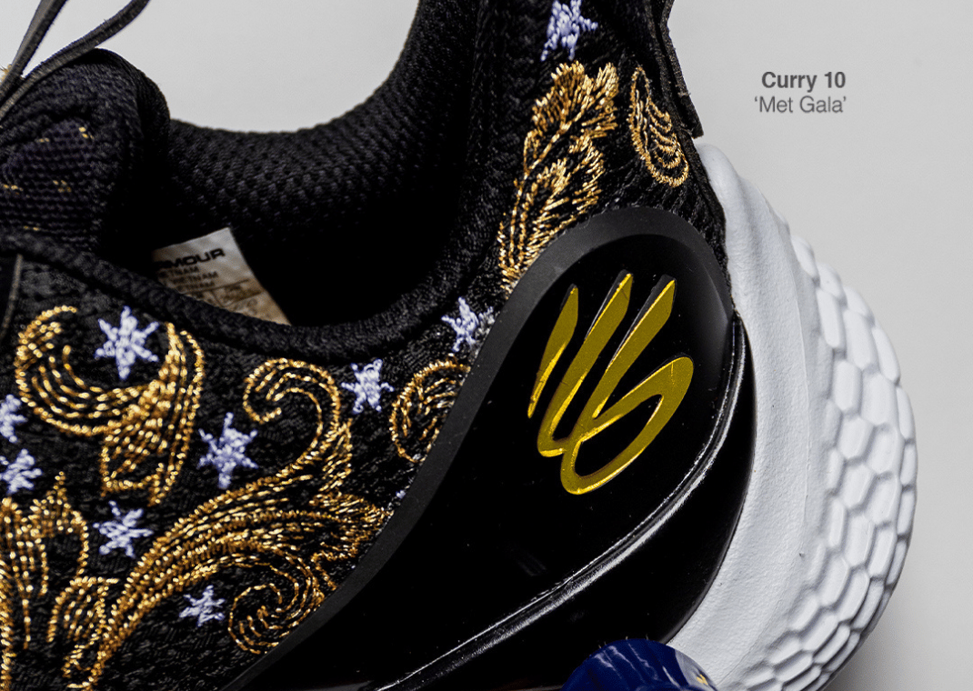 The other Curry 4 FloTro in the collection, Roses, coats the sneaker in a grey and white mixture with a floral rose pattern embossed atop the suede panel on the upper. Finally, the Curry 10 Met Gala, a pair that Curry dropped 50 points in back in May 2023, comes with a primarily black color palette accented by regal gold patterns.