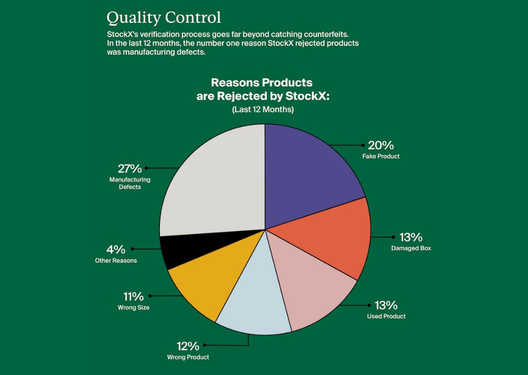 StockX has also broken down the top reasons it rejects products. Counterfeiting is actually the second leading reason for rejection and accounted for 20 percent of all rejections over the past year. The number one spot goes to manufacturing defects at 27 percent. Damaged boxes and used products each accounted for 13 percent of rejections, while 12 percent were for the wrong product. Rounding out the list is the wrong size at 11 percent, while the remaining 4 percent or rejections were for “other reasons.”