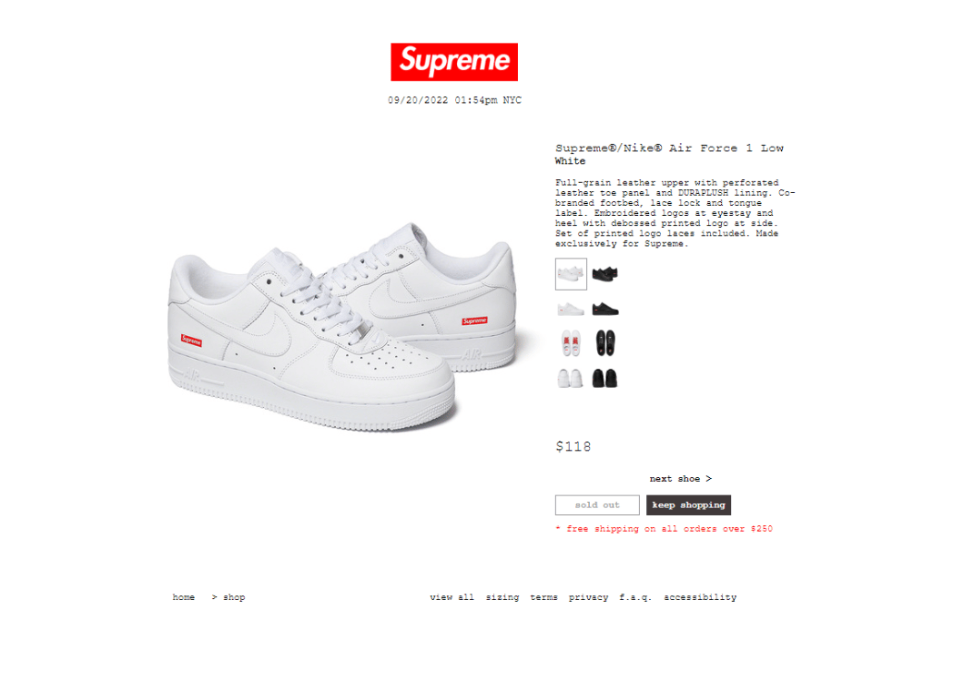 Long gone are the days of $90 AF1s and $100 Nike Dunk Lows as inflation continues to hit the wallets of consumers and company’s across the world. In the last 12 months, price increases have hit the aforementioned mainstay Nike silhouettes as well as Jordan Brand retro releases with the AJ 1 High now retailing for $180 and upwards depending on the colorway. With this in mind, it was odd to see the collaborative Supreme x Nike Air Force 1 actually retailing for the same exact price as the GR version directly from The Swoosh, though now it seems inflation has hit this constantly restocked pair.