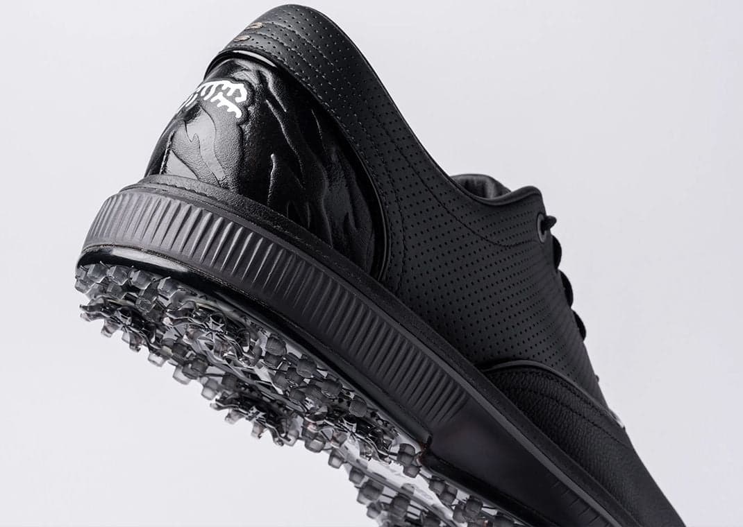 Inside, the silhouette features a hidden message from Tiger, the quotes "Do the work" and "Put in the time." For traction, Tiger ensured that greens preservation was key, adding a spike design that provides a tiger-like claw effect on the ground. Specifically, three concentric circles around each hexagon-shaped lug are combined with the four claw marks in the front and heel to mimic a tiger's footprint.