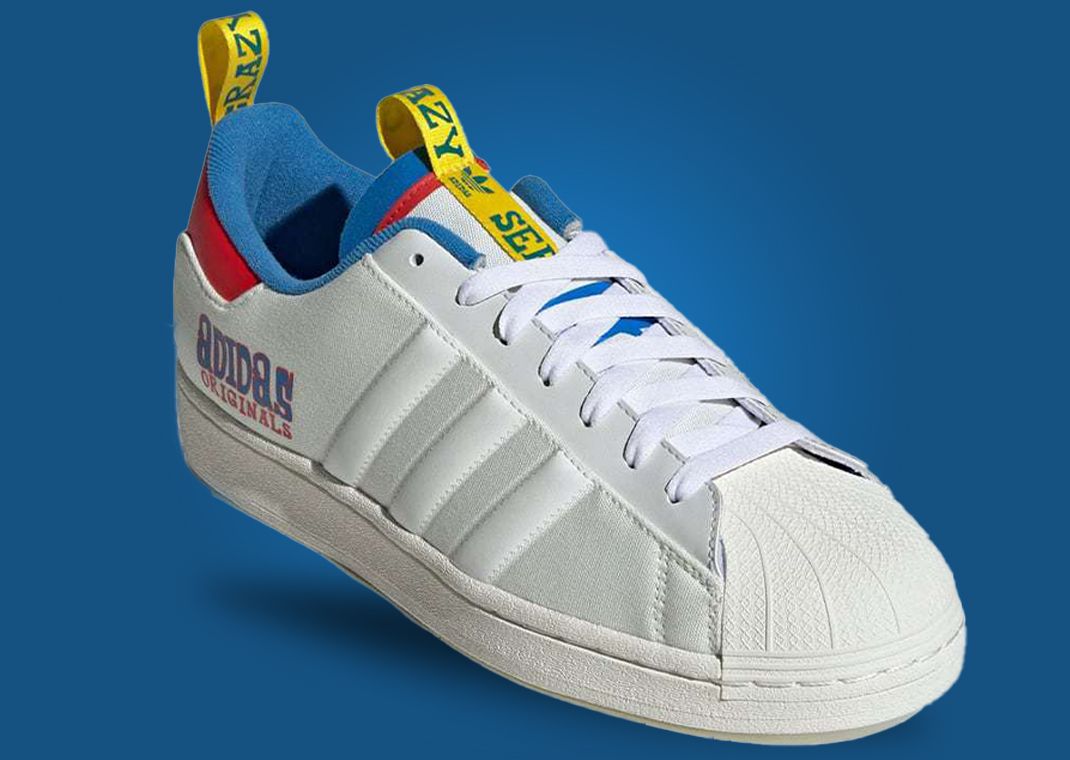 Continuing their mission to end plastic waste, adidas has chosen to use recycled materials in lieu of the standard Superstar construction. Base canvas coming in white wraps from heel to rubber shell toe cap. Layered canvas and a mesh tongue comes in a two-tone white and blue, with white laces running through the leather eyelet. Atop the tongue and heel, a yellow pull tab is dressed with adidas branding and “Crazy Serious” written in blue. Further adidas branding comes in the form of Three Stripes in white on the medial side and two-toned red and blue on the lateral side. Working back to the heel, adidas written in the font of Tony Chocolonely branding sits aside the red leather heel tab.