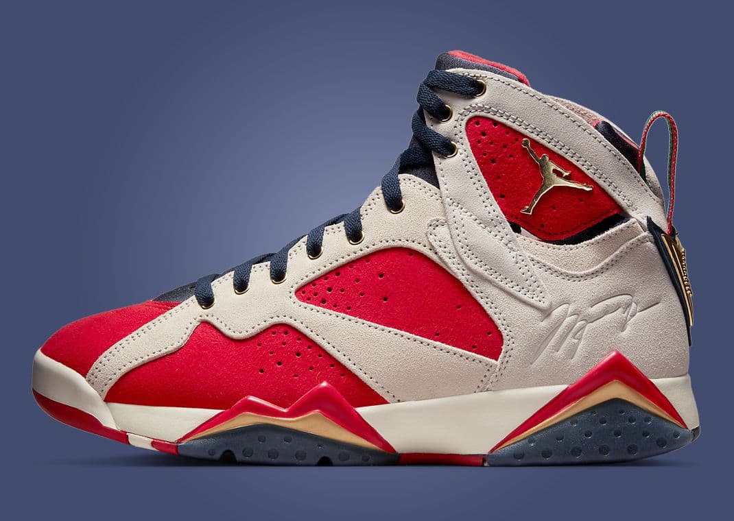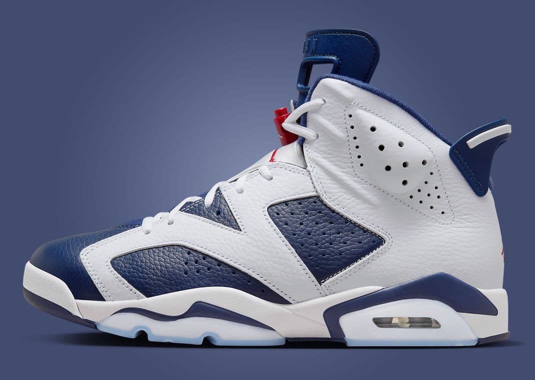 In 2000, Jordan Brand retroed the Air Jordan 6 for the first time. Three colorways were released. Among them was an all-new Retro+ iteration dubbed Olympic. Team Jordan member Ray Allen wore this pair on-court during the 2000 Summer Olympic Games in Sydney, Australia. The pair sports a red, white, and blue theme in Carmine-style colorblocking. Navy leather underlays pair nicely with white overlays. Minor hits of red are found via the Jumpman branding on the tongue and back heel, with a translucent outsole rounding things out. They were retroed for the first time in 2012, coinciding with the Summer Olympic Games in London, and then again in August 2024 for the games held in Paris.