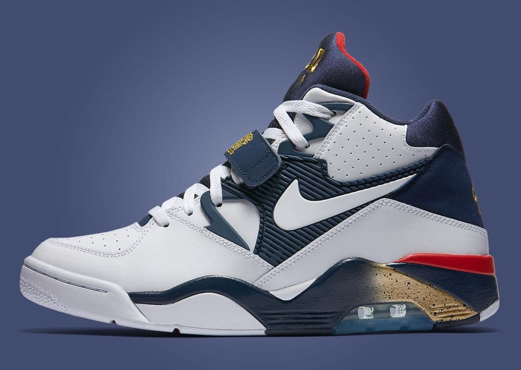 Charles Barkley and the Nike Air Force 180 were just as popular as Michael Jordan and the Air Jordan 7. Both come in similar color schemes; they nod directly to Team USA and the Dream Team. A white-based leather upper adorns the AF 180, accented by midnight navy accents. Metallic Gold branding is present throughout, including the midfoot strap, tongue, and back heel. Minor hits of red can be seen via the inside tongue lining and wrapping around the back heel. The midsole sports a gradient-like design that fades from navy to gold with paint splatter details. Initially released in 1992, they were re-released in 2004, 2012, and 2016.
