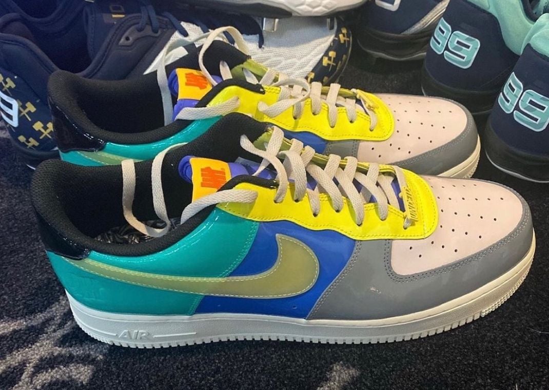 Neutral shades clash with vibrant hues across the patent leather upper as the mudguard and toebox come in grey and white respectively, while from the quarter panel back bright colors appear. A yellow vamp and eyestays host a set of white laces, held together on the bottommost eyestay by a “UNDFTD” branded lace dubrae. Atop the blue mesh tongue sits another UNDFTD branding detail as its 5 strikes symbol gets covered in orange while the same logo gets debossed on the teal overlay back on the heel. As for the Nike Swoosh, a green-tinted semi-translucent material is used while it reaches back and tucks beneath a dark blue heel tab. Underfoot, a white-on-white rubber midsole and outsole complete the look.