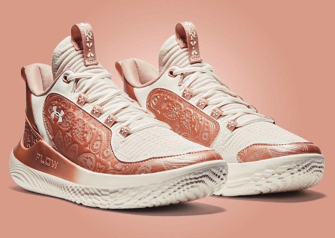 The upper comprises suede, mesh, and leather, with the base coming in a cream-shaded mesh along the toe and tongue. More cream hues land along the leather panel near the collar and midfoot, while the leather back on the heel takes on a copper shade. This same copper hue is applied to the panel stretching from the midfoot to the toe, debossed with an intricate floral pattern. This same floral pattern is used on the back heel's overlay and insole. Branding details include the Under Armour logo along the midfoot and the Kelcey Plum logo atop the tongue's pull tab. Underfoot sits a UA Flow midsole with a gradient effect on the top portion, transitioning from copper to cream, paired with a cream UA Flow outsole.