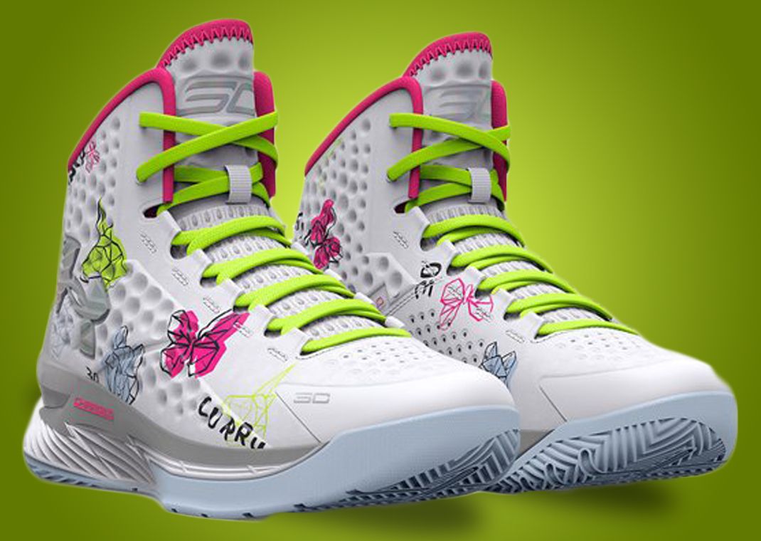 Coming to us in a “Tattoo” colorway, the shoe is aptly named as the leather upper comes covered in various tattoo-like drawings of butterflies, unicorns, and bears as well as text denoting the Steph Curry connection. These come in an assortment of colors while most of the sneaker remains colorless, though neon pink and green shades land on the sockliner and laces respectively. Under Armour branding gets placed in its typical locations, along the lateral side of the profile, while Curry logos and branding can be found on the insole, medial profile, and back on the heel. Underfoot, a grey and white midsole comes paired with a baby blue rubber outsole.