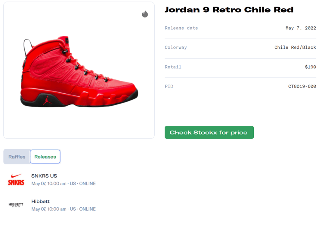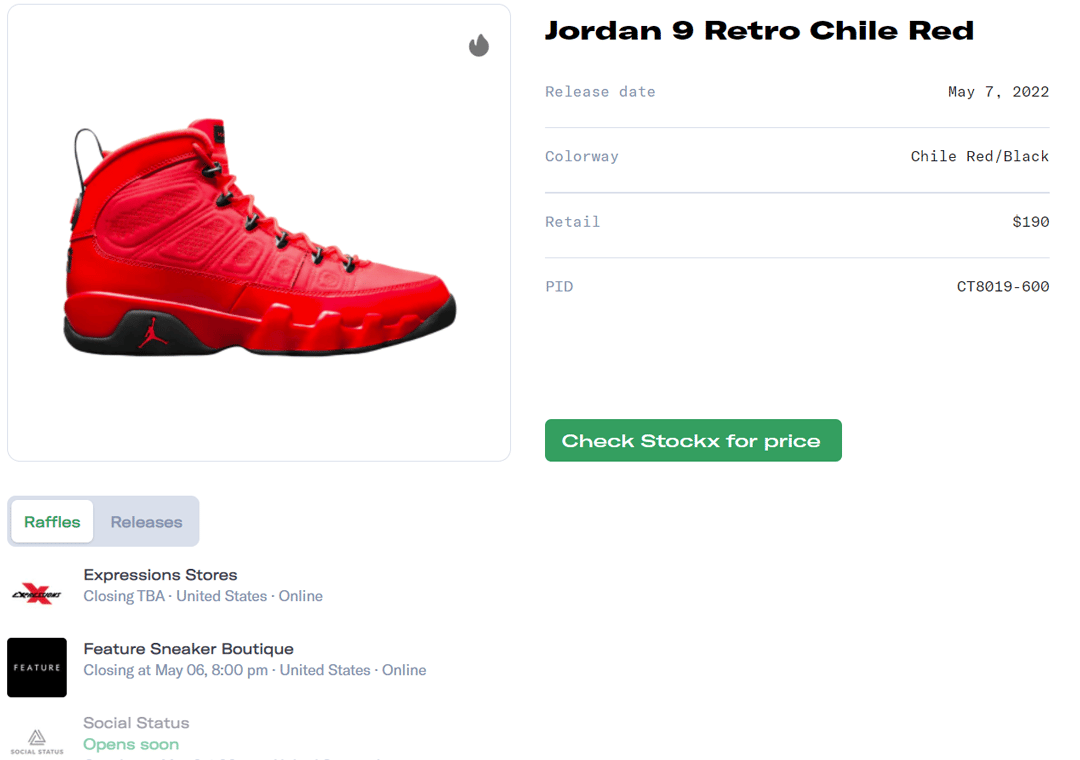 Raffles for the Air Jordan 9 Retro Chile Red have already started. There are over 30 raffles that are currently open at different retailers across the globe. Our raffle guide makes it easy to filter and find raffles that you're eligible to enter. To increase your chances of winning raffles for the Air Jordan 9 Retro Chile Red, enter all raffles that you can. A few of the best retailers to enter raffles for are Footlocker, Footaction, Eastbay, and Champs.