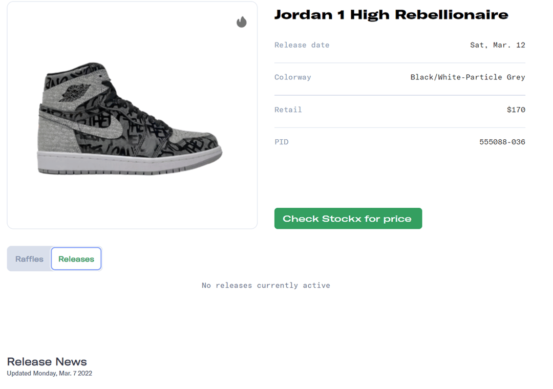 At this time, there is no online release scheduled for the Air Jordan 1 High Rebellionaire. All releases will be done via Raffles and in-store drops. We will keep you updated as both release dates draw nearer.