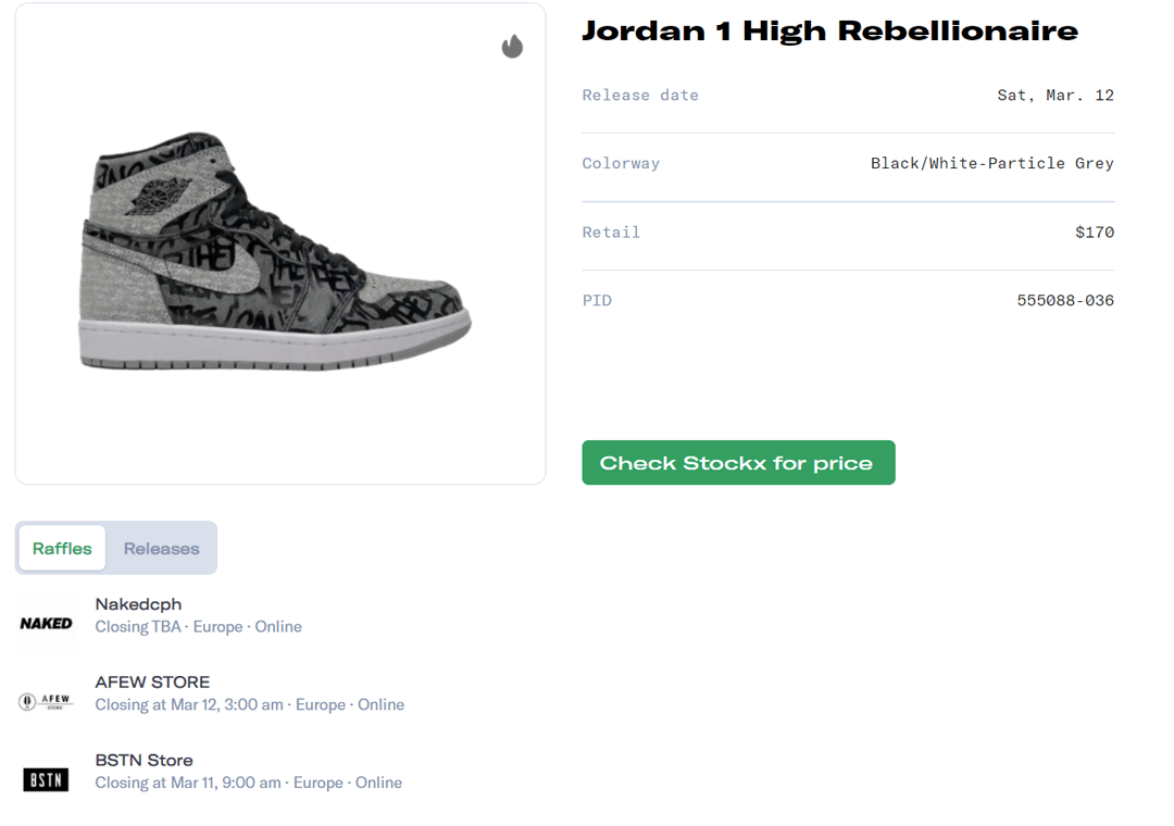 Raffles for the Air Jordan 1 Retro High OG Rebellionaire have already started. There are over 10 raffles that are currently open at different retailers across the globe. Our raffle guide makes it easy to filter and find raffles that you're eligible to enter. To increase your chances of winning raffles for the Air Jordan 1 Retro High OG Rebellionaire, enter all raffles that you can. Remember, no chain stores will be carrying this release, only select NBHD and boutique retailers.