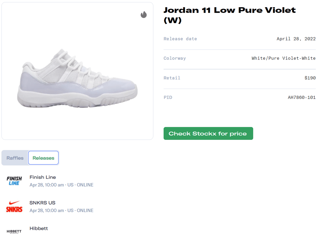 Raffles for the Air Jordan 11 Retro Low Pure Violet W have already started. There are over 30 raffles that are currently open at different retailers across the globe. Our raffle guide makes it easy to filter and find raffles that you're eligible to enter. To increase your chances of winning raffles for the Air Jordan 11 Retro Low Pure Violet W, enter all raffles that you can. A few of the best retailers to enter raffles for are Footlocker, Footaction, Eastbay, and Champs.