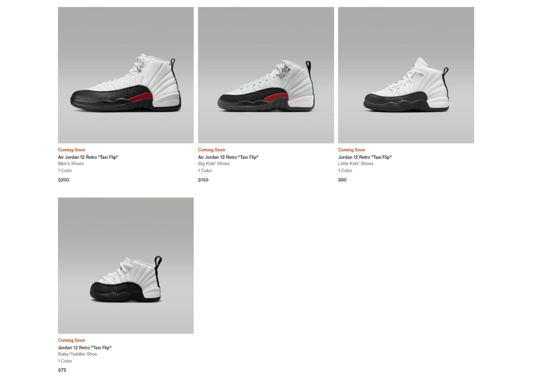 The Jordan 12 Taxi Flip will release in full-family sizing, available in men's, grade school, pre-school, and toddler. The sneaker is a GR (general release), so the pair will be accessible through multiple retailers. The best option will be through Nike, which will have the most stock and offer free shipping/returns.