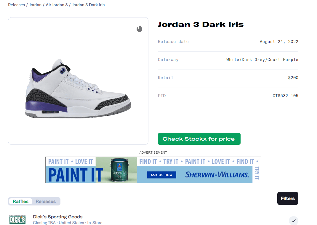 Retailers across the US have begun their raffle process for the AJ 3 Dark iris with staple boutiques such as TWG storefronts, Extra Butter, and BAIT on top of footsites like DSG, Champs, and Foot Locker. To increase your chances of winning raffles for the Air Jordan 3 Dark Iris, enter all raffles that you are eligible for.