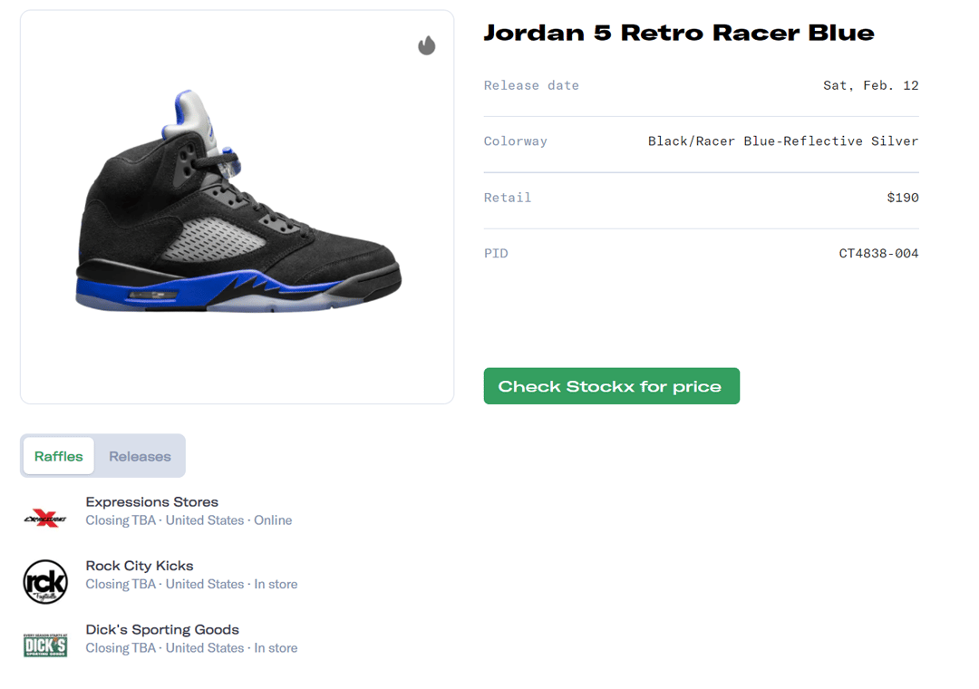 Raffles for the Air Jordan 5 Retro Racer Blue have already started. There are over 30 raffles that are currently open at different retailers across the globe. Our raffle guide makes it easy to filter and find raffles that you're eligible to enter. To increase your chances of winning raffles for the Air Jordan 5 Retro Racer Blue, enter all raffles that you can. A few of the best retailers to enter raffles for are Footlocker, Footaction, Eastbay, and Champs.