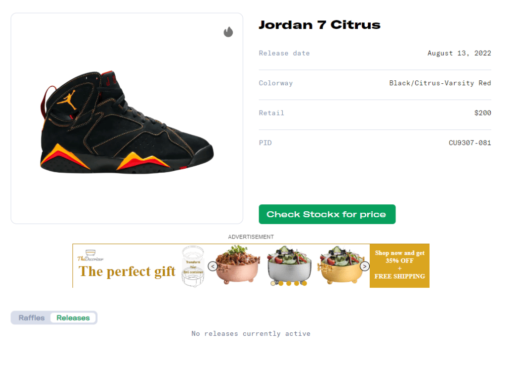 With an EU and APAC release earlier this year, US retailers have their raffles ready to go such as The Whitaker Group’s storefronts, A Ma Maniere, APB Store, and Social Status, as well as retailers like Champs, Footlocker, and Hibbett Want to see every available raffle? Check out our raffle guide, which makes it easy to filter and find raffles that you're eligible to enter. To increase your chances of winning raffles for the Air Jordan 7 Citrus, enter all raffles that you are eligible for.