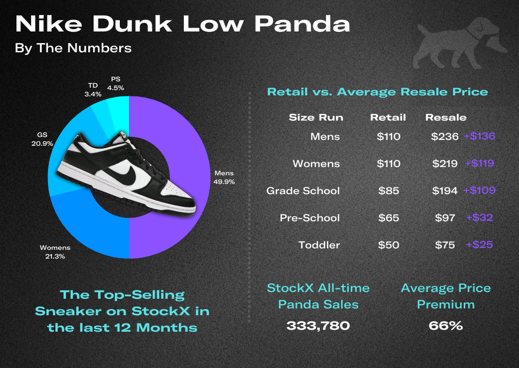 Despite Nike releasing millions of pairs of the Nike Dunk Low Panda, the sneaker still remains one of the top selling sneakers on StockX. However, over the past year, it has decreased dramatically on the secondary resale market. Pairs can now be had for retail and sometimes even less. A dramatic shift from original StockX data (at the time of the original writing in September 2022) that showed that the Nike Dunk Low Panda is the most popular sneaker ever with almost 350k sales YTD and an average price premium of 66% across the size-run. In March 2023, the pair's price premium had decreased to around 32% and YTD sales numbers show 233k pairs have been purchased/sold on the marketplace. Even though there has been a decrease in its price and sales number, the Nike Dunk Low Panda continues to be unbrickable.