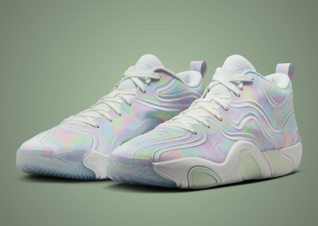 The silhouette retains its multi-paneled and material upper, dipping its toes into the iridescent realm with a collage of colors, akin to the iridescent nature of snakeskin, laid below the upper. Separating the various panels are tonal embroidered lines that form wavy shapes, keeping the ripstop and mesh material in place. Summit White laces match the jersey mesh tongue that hosts Jayson Tatum branding up top and contain an added snakeskin hangtag found on the Jordan 1 Low and Jordan 11 Low that is a part of the collection.