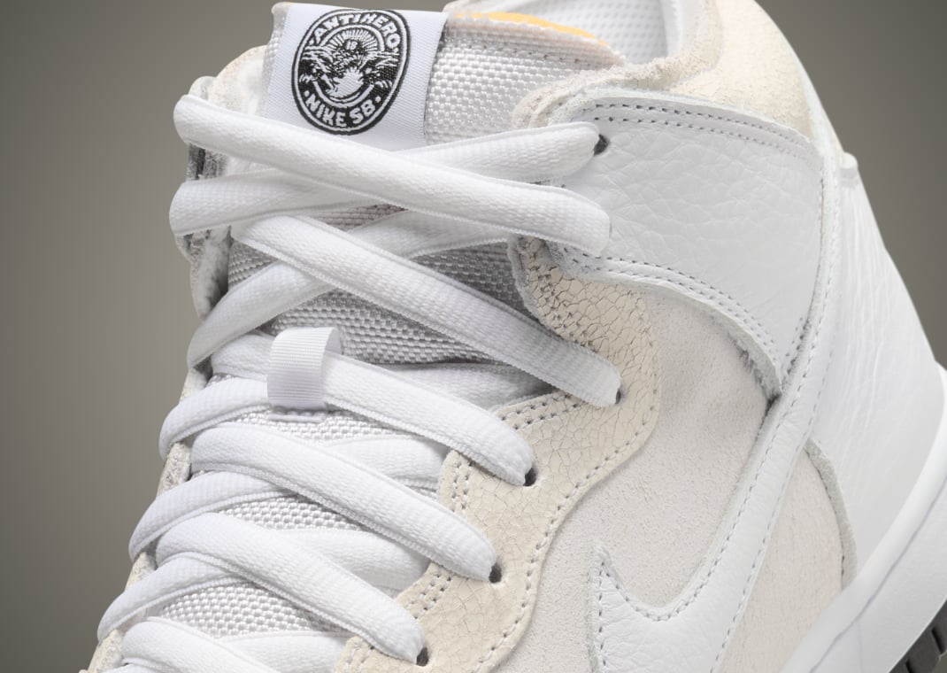 Antihero Skateboards’ newest Nike SB Dunk High features a distinctive blend of materials and textures that embody the brand's rebellious ethos. The upper is constructed with cracked leather detailing on the toebox, eyestays, and collar, giving the sneaker a well-worn, battle-tested appearance. This design is complemented by premium tumbled leather on the heel and collar overlay and a suede midfoot panel, adding layers of texture and depth to the design. The Swoosh is crafted from more tumbled leather, enhancing the luxurious feel of the sneaker.
