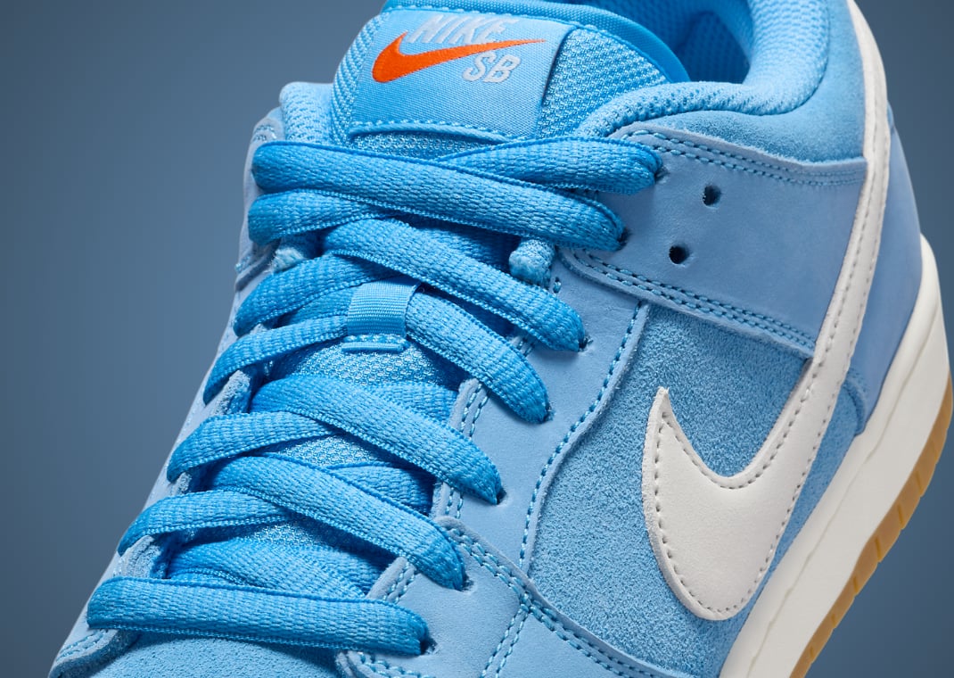 The SB Dunk Low Pro ISO University Blue features a sophisticated blend of materials and hues. The upper showcases a combination of suede and nubuck, with all panels drenched in varying shades of blue. Darker blue suede graces the toe, midfoot, and collar, while lighter blue nubuck adorns the mudguard, eyestays, and heel overlay, creating a harmonious contrast. This tonal blue theme extends to the fat rope laces and the padded tongue, enhancing the shoe's cohesive look. The tongue tag sports an eye-catching orange Swoosh, adding a pop of color that complements the overall design.