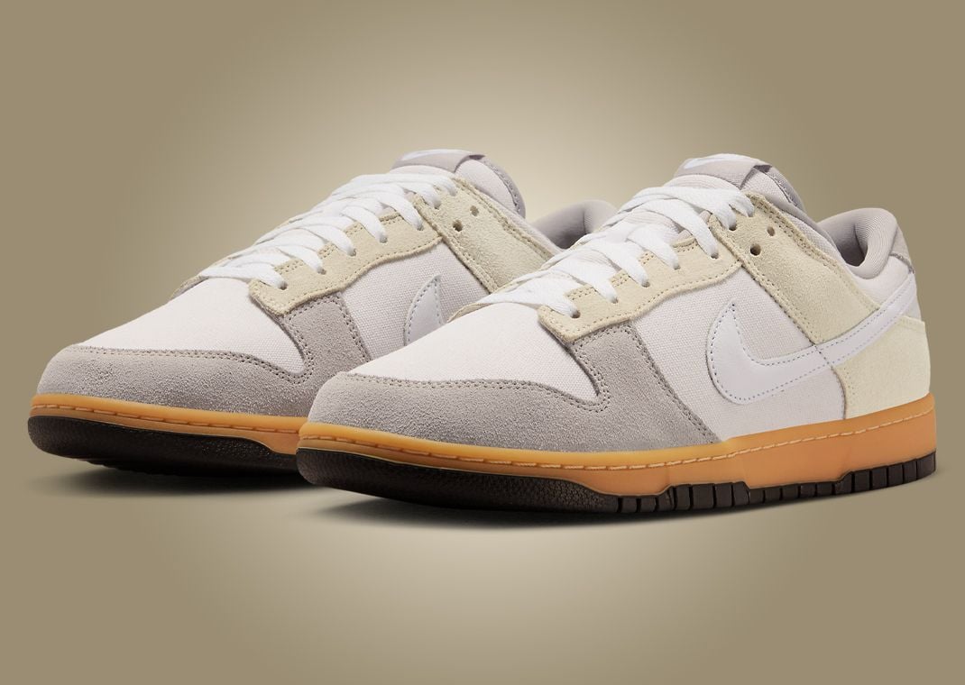 Suede and canvas details appear on this new Dunk Low, featuring a colorblocking not often found on the silhouette. College grey suede hits the mudguard and heel tab, while the eyelet and heel overlay come in a tan hue. Below the suede paneling sits a phantom-shaded canvas base, present on the toe, tongue, midfoot, and collar.