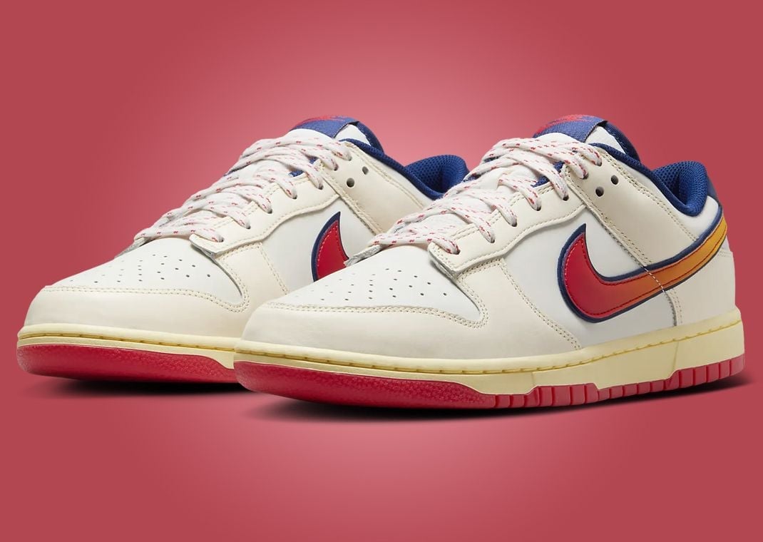 Grounded by neutral hyes of sail and pale ivory, this color features vibrant accents on select details. Along the Swoosh, we see a gradient pattern applied, transitioning from a deep red hue to orange as you move back toward the heel. Lining the logo and appearing on the heel tab, sockliner, and woven tongue label are hits of blue void.