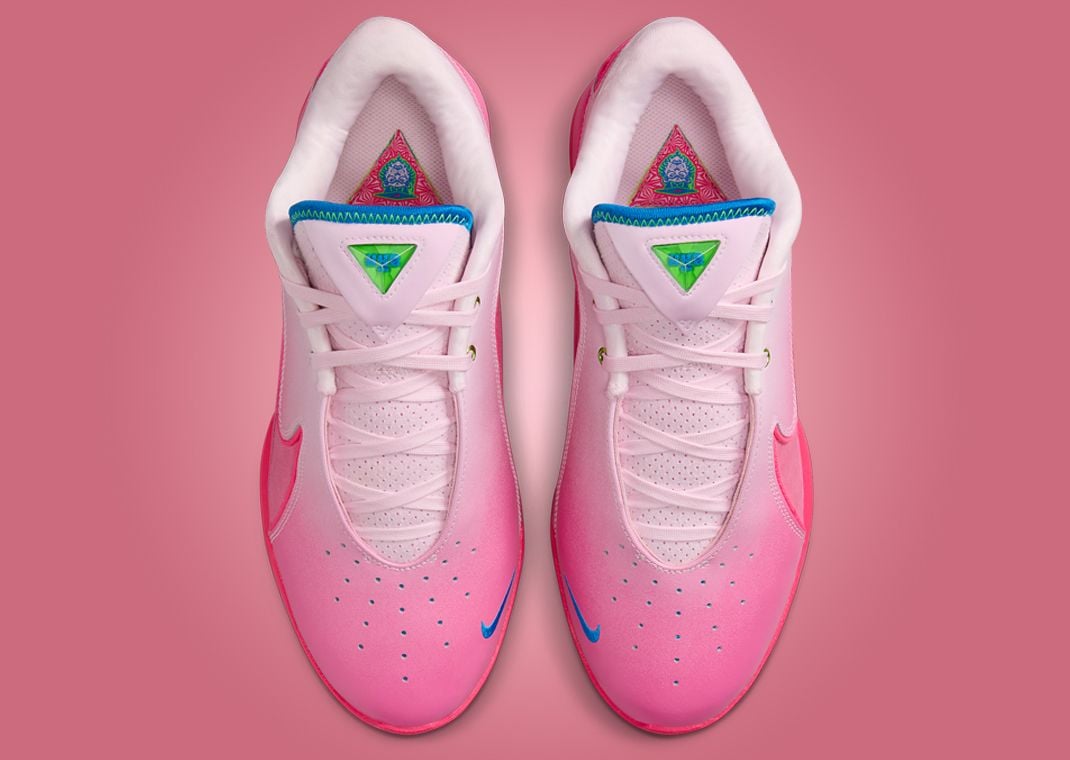 Previously, the I PROMISE theme was found on the LeBron NXXT Gen, NXXT Gen Ampd, Witness 8, and various mainline Nike LeBron sneakers, with this Nike LeBron 22 marking the first time since the LeBron 19 that his school was honored on the numerical LeBron series. Across the upper, a gradient pink effect is applied to the leather portions, starting in a hot pink near the toe and transitioning into a softer hue toward the collar. The shade of pink gets even lighter as you move to the perforated suede tongue and lace set, which also contains contrasting hits of volt green and blue along the lining of the tongue and the branding window.