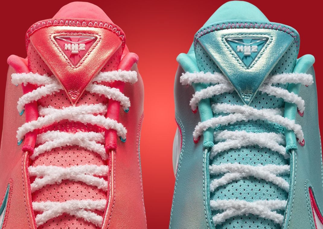 Taking on a split design, Christmas colors of white, red, and dusty cactus cover the upper of the left pair. A metallic shine is applied to the dusty cactus portions, wrapping around the toebox, collar, and midfoot, while the white Swoosh cutout is trimmed with red nylon. This red nylon extends onto the heel tab and forms LeBron’s signature.