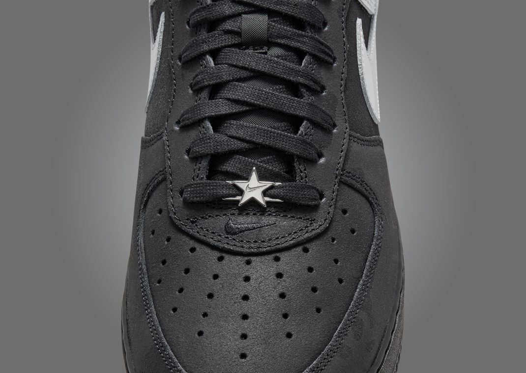 The silhouette showcases a split design, combining black hues on the toe, mudguard, eyestays, and midfoot with liquid metal-like metallic silver accents on the Swoosh and heel portions. However, when hit with a flash, the mudguard and eyestays give off a reflective pattern representing the foggy weather associated with San Francisco, the host of this year’s NBA All-Star festivities. Nods to the event are found on the lace dubrae, with a custom metal star logo added to the waxed black lace set.