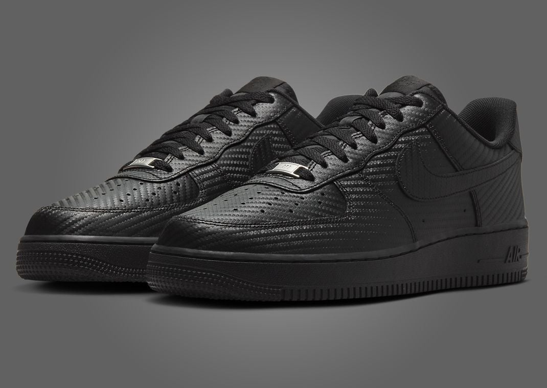 Maintaining the stealthy all-black look, this new AF1 comes coated in a synthetic carbon fiber material across all of its paneling. This design covers the mudguard, toebox, eyestays, midfoot, Swoosh, heel, and collar. Stark black laces rest above the nylon tongue and feature a metallic silver AF1-branded lace dubrae, the only non-black hit on the sneaker besides the Nike Air text on the insole.