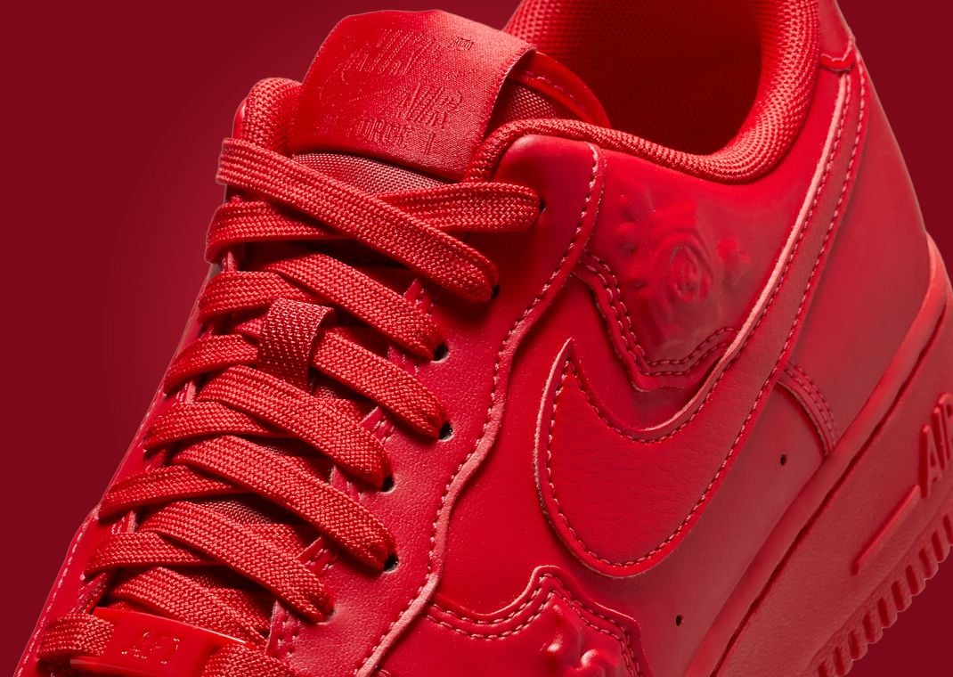 Just like the two previously mentioned Dunk Low with roses, and unlike the Black White Roses pair, this pair sees rose petals infused into the leather paneling of the sneaker. The silhouette from top to bottom is coated in university red but retains key design details of the AF1, like the perforated toebox, lace dubrae, eyestays, and Swoosh on the midfoot. However, the mudguard, collar, and medial heel come redesigned to feature a rose petal embedded into the leather.